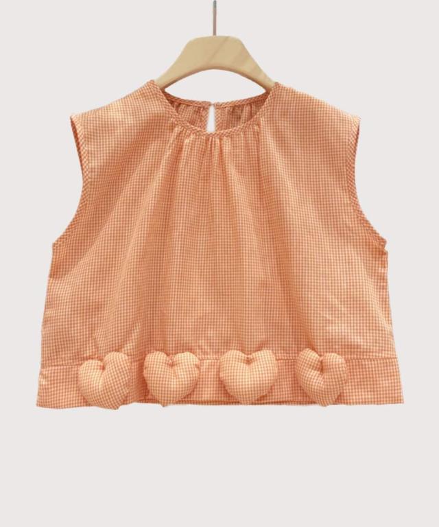 ふんわりと広がるシルエットに、ぷっくりとしたハートの飾りがついたノースリーブプルオーバー。ガーリーなチェック柄と立体モチーフの組み合わせで、おしゃれ心をくすぐるデザインです。