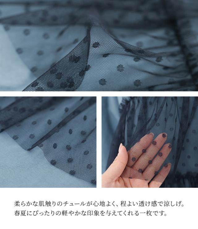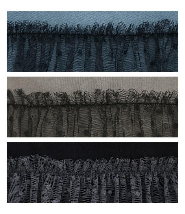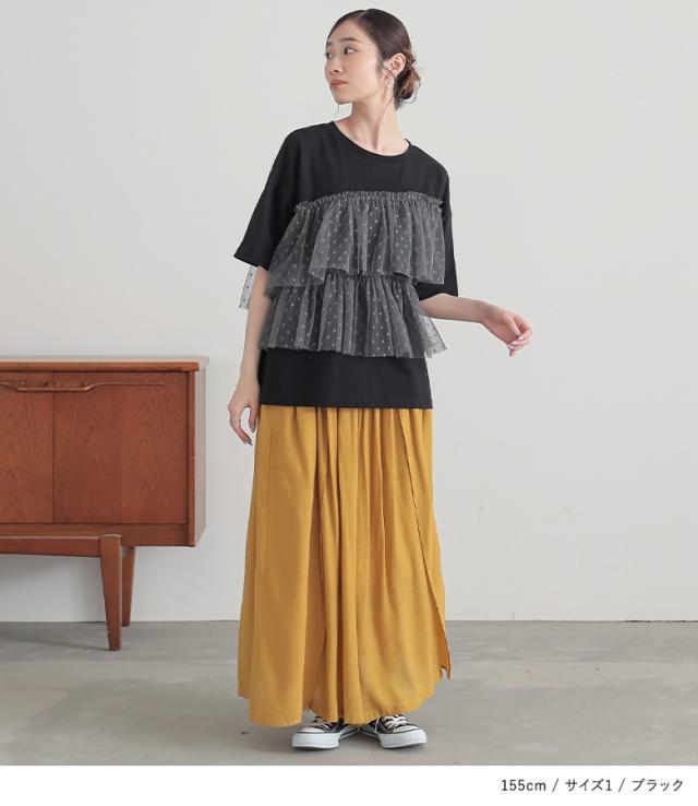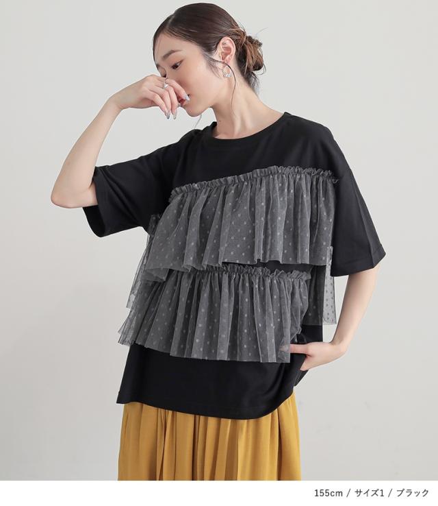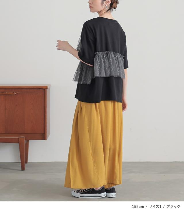 『ドットチュールドッキングカットソー』※メール便可※【10】[Tシャツ レディース トップス 半袖 カットソー チュール ドット柄 無地 綿100% クルーネック アシンメトリー アシメ 二の腕カバー 春 夏]
