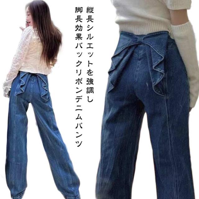 デニム フレアパンツ レディース デニム ワイドパンツ 春 夏 ワイドデニムパンツ バックリボンデニムパンツ ジーンズ ワイドパンツ ジーパン レトロ モード おしゃれ 美脚パンツ 美脚ライン 脚長効果 春秋 秋冬 秋 冬 きれいめ かわいい オールシーズン