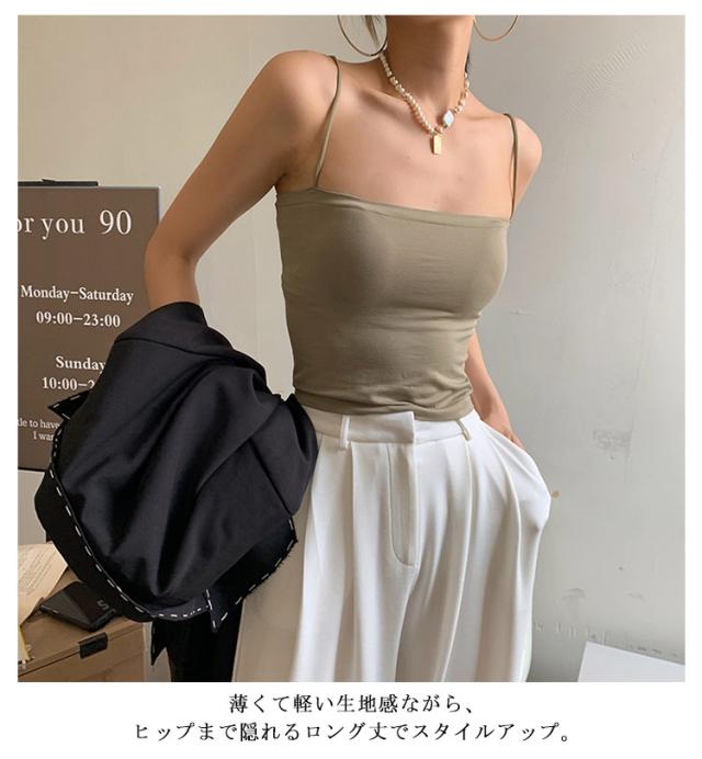| 固定タイプのブラパッドが内蔵されているので、面倒なブラジャーいらず。ノンワイヤーで締め付け感ゼロ、楽ちんな着心地 シンプルで上品なデザインは、1枚で着ても、ジャケットやデニムシャツと合わせても大人っぽくキマる。 外出にも部屋着にも使える優秀アイテム。 細ストラップで女性らしさアップ 華奢なストラップがデコルテを美しく見せて、夏の肌見せコーデにぴったり。重ね着してもゴワつかず、スッキリ着こなせます◎ 薄くて軽い生地感ながら、ヒップまで隠れるロング丈でスタイルアップ。 通気性が良く、汗ばむ季節でも快適。柔らかな肌触りで、長時間着てもストレスフリー。暑い夏にぴったりな1枚。 | |