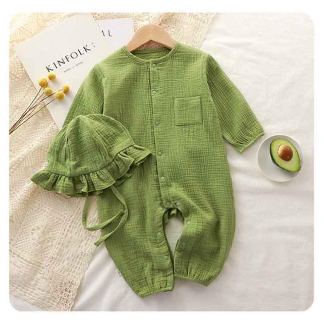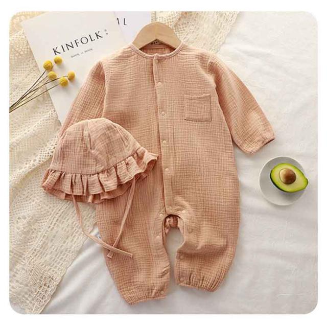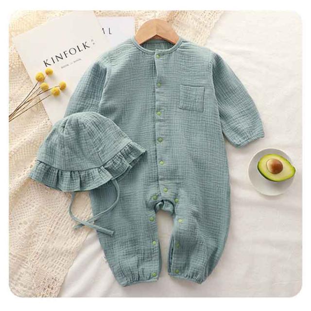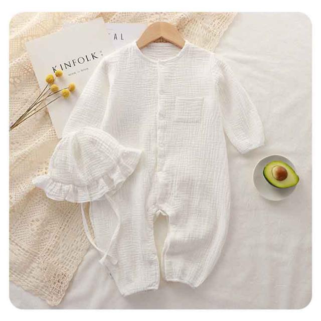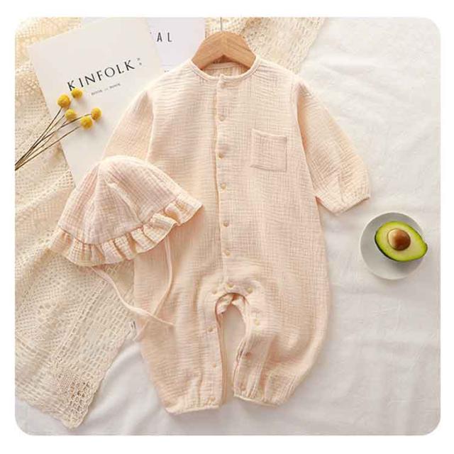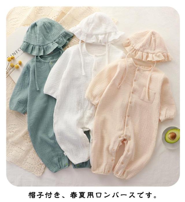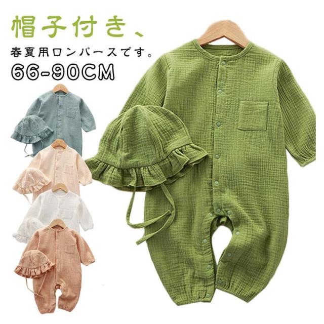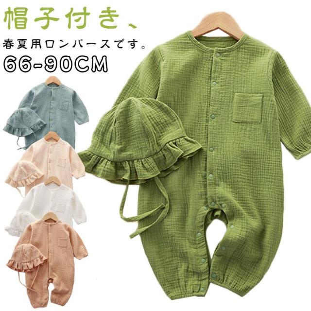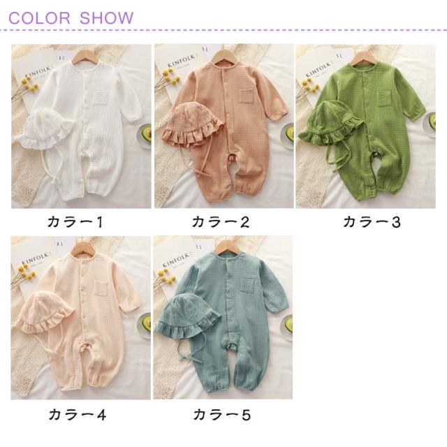 ハット付き ロンパース 長袖 前開き ガーゼ綿 男の子 女の子 オーバーオール カバーオール ベビー服 赤ちゃん服 子供服 部屋着 新生児 コットン 綿 無地 おしゃれ かわいい シンプル 春 夏 秋