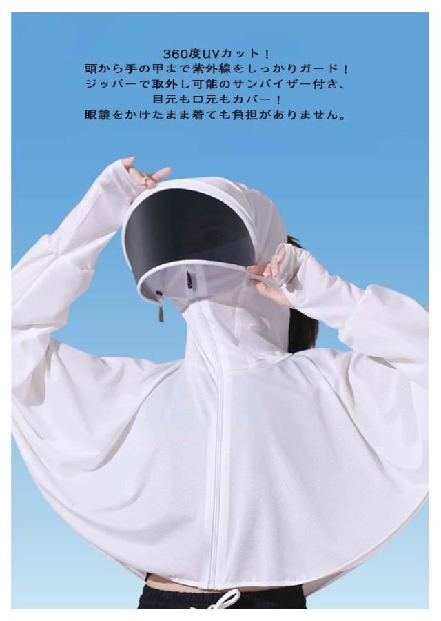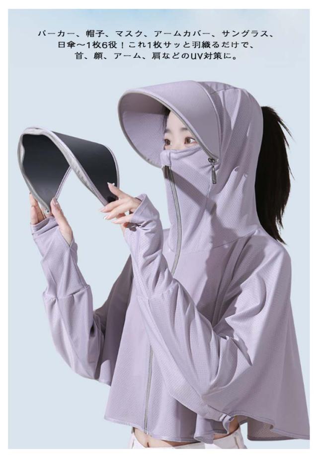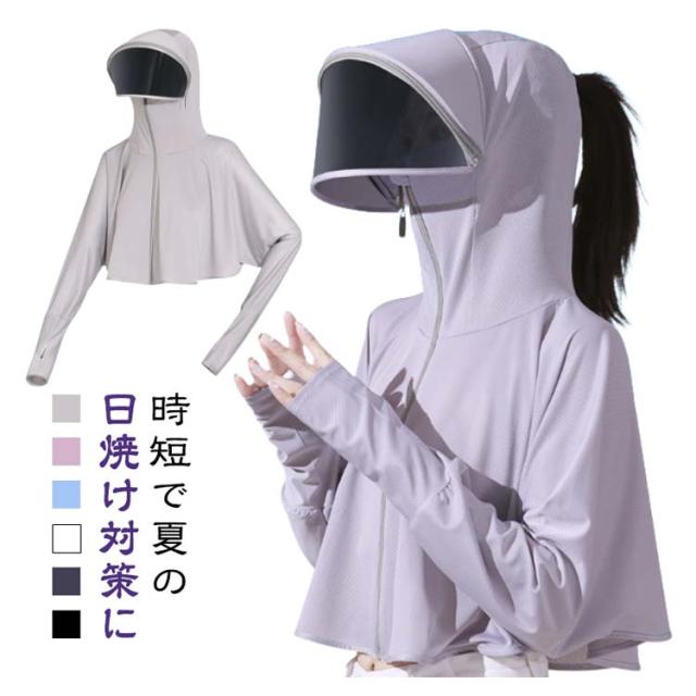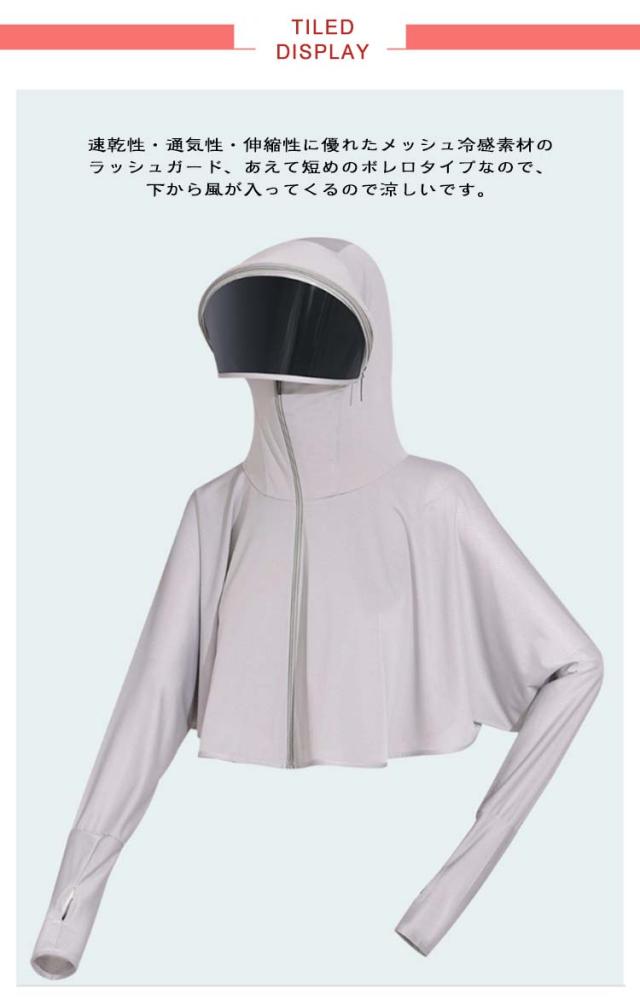 | 時短で夏の日焼け対策に♪ パーカー、帽子、マスク、アームカバー、サングラス、日傘〜1枚6役!これ1枚サッと羽織るだけで、首、顔、アーム、肩などのUV対策に。 360度UVカット!頭から手の甲まで紫外線をしっかりガード! ジッパーで取外し可能のサンバイザー付き、目元も口元もカバー!眼鏡をかけたまま着ても負担がありません。 これ一枚で自転車走行可能で、支度も持ち物も楽になり、着ていても涼しくて夏の日焼け対策にぴったり。 速乾性・通気性・伸縮性に優れたメッシュ冷感素材のラッシュガード、あえて短めのボレロタイプなので、下から風が入ってくるので涼しいです。 薄手で軽やかで、しわになりにくい素材なのでバッグに入れて持ち運びも◎。 バランスが取りやすいショート丈、普段コーデにも合わせやすい◎ラッシュガードっぽく見えないおしゃれなデザイン、これからの季節に手放せない1枚。 さっと羽織るだけで、運転、自転車の送り迎え、お子様との公園遊びやプールの付き添いなど様々なシーンで大活躍するショート丈uvカットパーカー。 水陸両用で、水着の上にさっと羽織るだけで、海やプール、レジャーシーンにも◎ フードに髪の毛を出せる隠しファスナー付きホールデザイン、髪を結んだまま被せるからとても便利なフード付きラッシュガード。 | |