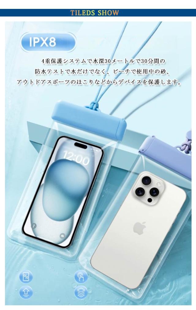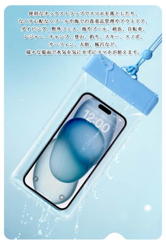 | 4重保護システムで水深30メートルで30分間の防水テストで水だけでなく、ビーチで使用中の砂、アウトドアスポーツのほこりなどからデバイスを保護します。 高透光なので、水気のある場所でもスマホの画面がクリアに見られ、写真撮影・ビデオ鑑賞・Face ID顔認証に対応可能です。 便利なネックストラップでスマホを落としたり、なくす心配なくプールや海での貴重品管理やアウトドア、ダイビング、野外フェス、海やプール、砂浜、自転車、レジャー、キャンプ、登山、釣り、スキー、スノボ、サーフィン、入浴、風呂など、様々な場面で水気を気にせずにスマホが使えます。 ご注意:ご使用の前に必ず携帯の代わりにティッシュをケースに入れて、防水ケースは水没して30分間の防水テストを行ってください。 | |