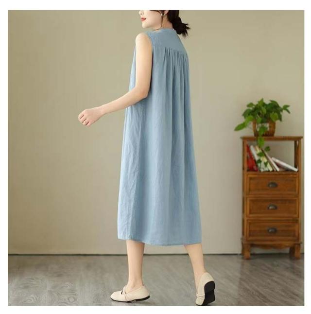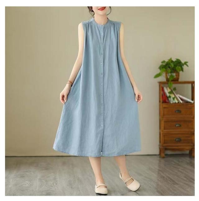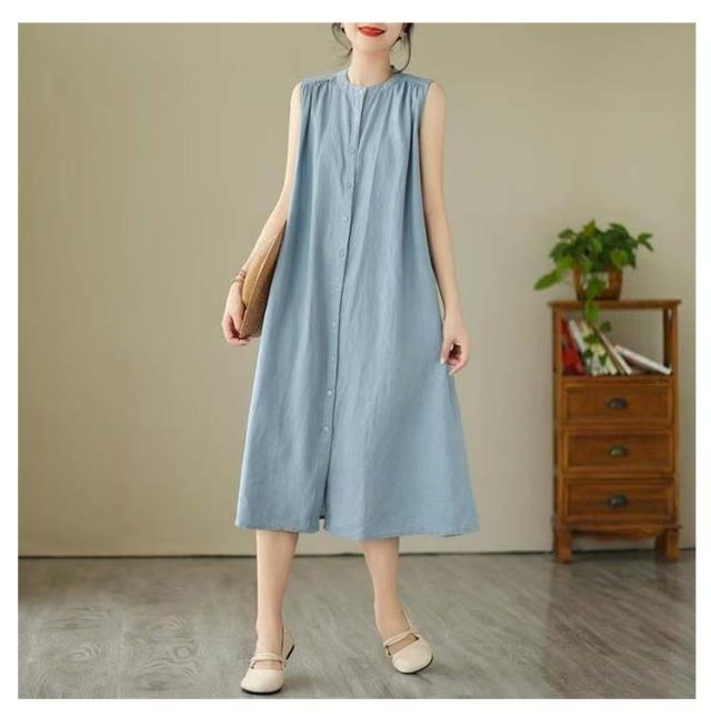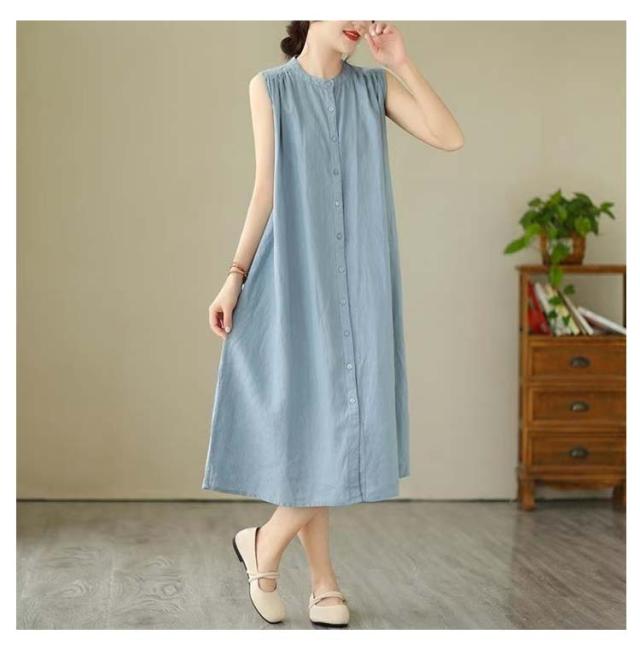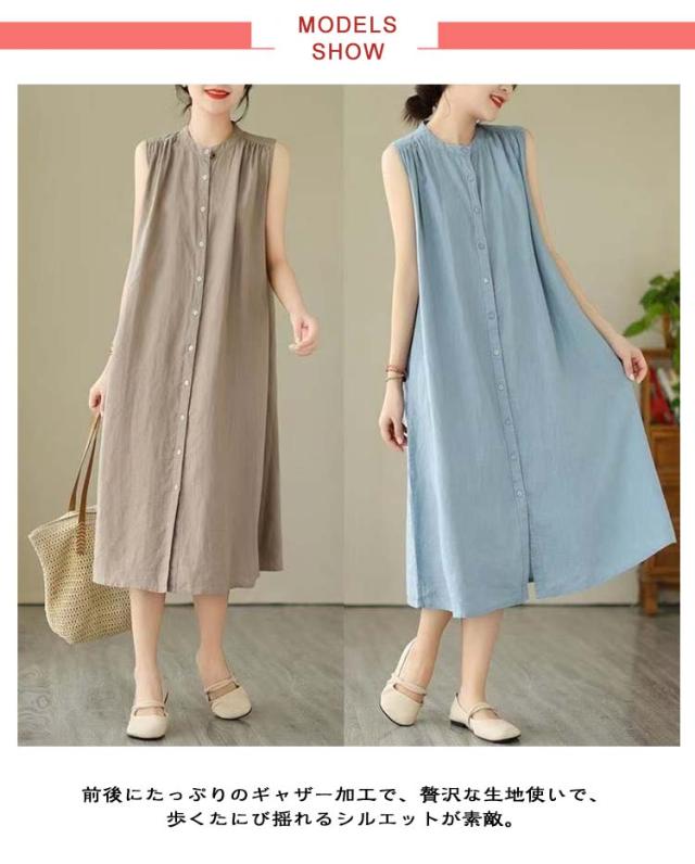 ノースリーブ 袖なし ミモレ丈 シャツワンピース ギャザー ワンピース ロング ハンドカラー 羽織り シャツ リネン風 ギャザー ワンピース ロングシャツ ギャザー 綿麻調 春 夏 無地 マタニティ