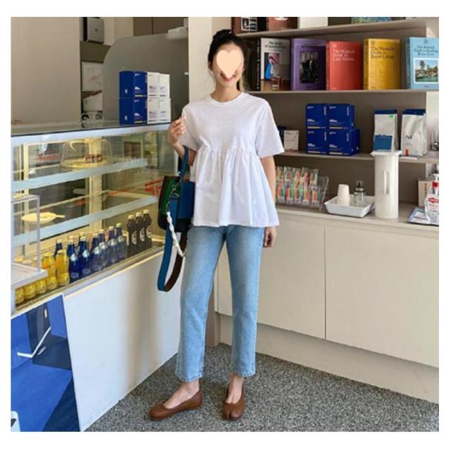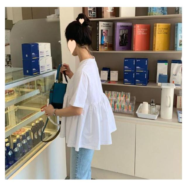 | バッグフリルカットソー S〜3XL Tシャツとブラウスの中間のようなカジュアルデザインです。 絶妙な丈感でお尻周りもふわっと体型カバー♪ あっさりした首回りでアクセサリーも映えること間違いなし! | |