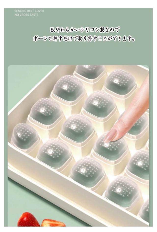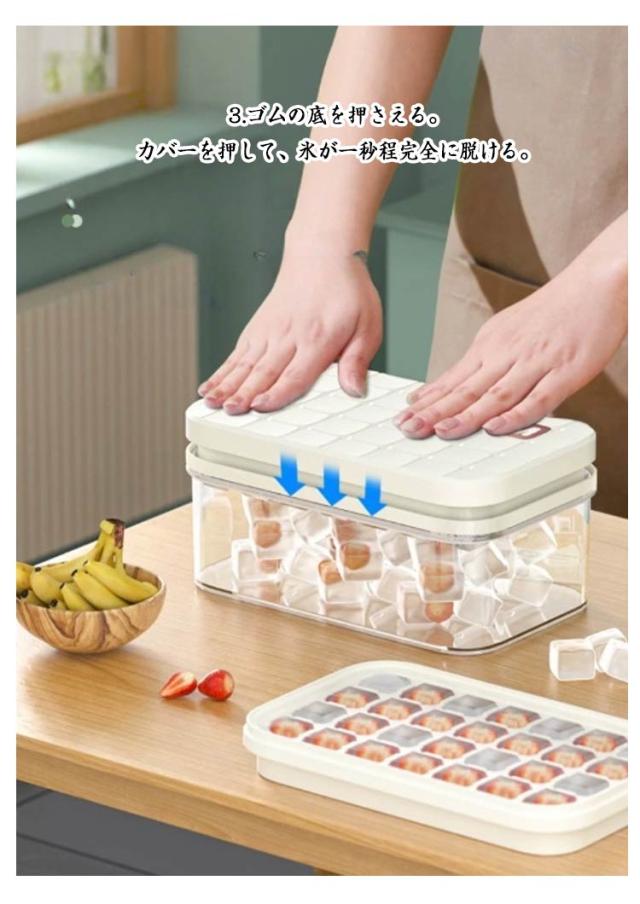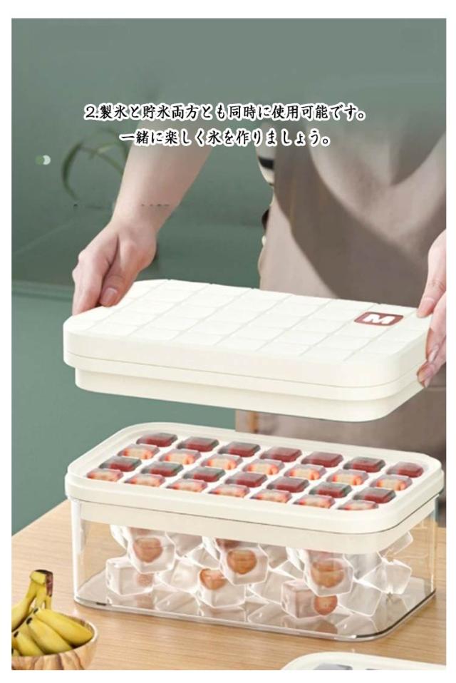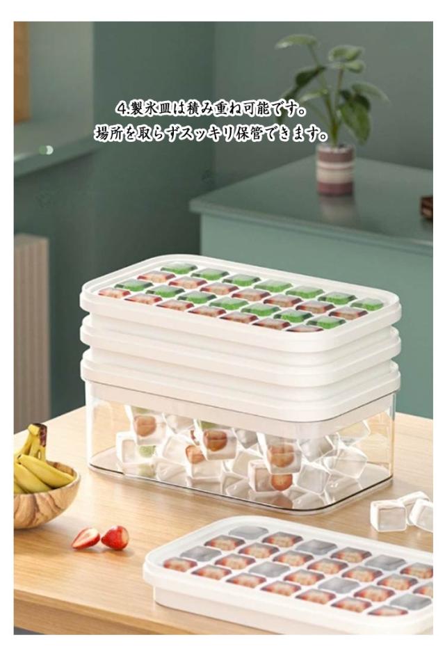 | 1.蓋付きで衛生的です。 保管時のにおい移りやほこりなどの混入を防ぎます。 2.製氷と貯氷両方とも同時に使用可能です。一緒に楽しく氷を作りましょう。 3.ゴムの底を押さえる。 カバ一を押して、氷が一秒程完全に脱ける。 4.製氷皿は積み重ね可能です。 場所を取らずスッキリ保管できます。 5.やわらかいシリコン製なのでポ一ンと押すだけで取り外すことができます。 6.氷ボックスと氷スコップが付属 製氷機のない環境でも、こちらの商品があれば製氷?保管が簡単にできます。 7.水が溢れるのを防ぎます。 | |