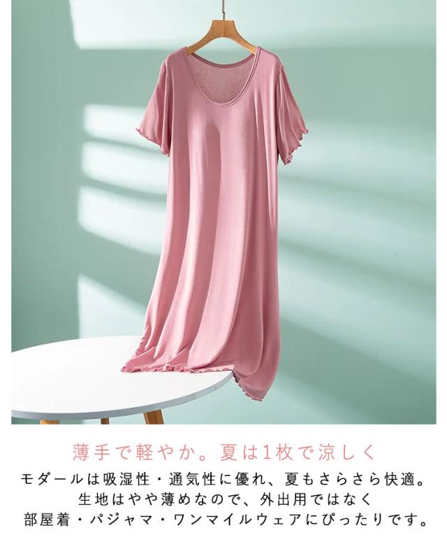 | ■ 1枚でラクして、ちゃんとキレイ。 ナイトブラとワンピースがひとつになった、 おうち時間のための“ふんわり楽ちんワンピース”。 モダール素材のとろけるような肌ざわりで、 着た瞬間からストレスフリー。 ■ ブラ付きだから、これ1枚でOK。 締めつけのない一体型カップ入りだから、 下着いらずでそのままリラックス。 洗濯物も減って、気分もゆったり。 ■ 薄手で軽やか。夏は1枚で涼しく。 モダールは吸湿性・通気性に優れ、夏もさらさら快適。 生地はやや薄めなので、外出用ではなく 部屋着・パジャマ・ワンマイルウェアにぴったりです。 ■ 身体のラインを拾いすぎず、きれいなドレープ感。 | |