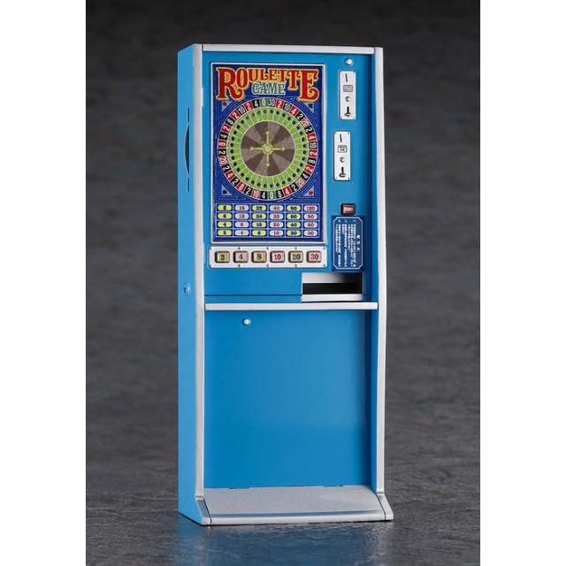 懐かしのルーレットゲームが登場!背面の透明窓から透過させた光を回転させることで、ルーレットゲームの雰囲気を楽しめるギミックを搭載。組立は接着剤不要。パーツカラーはブルー、グレー、クリアー。オマケとして、景品の箱、メダル(単体)、排出口用のメダルの山が付属。パネルやボタン部分用のシールが付属します。