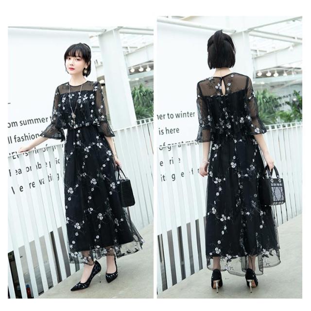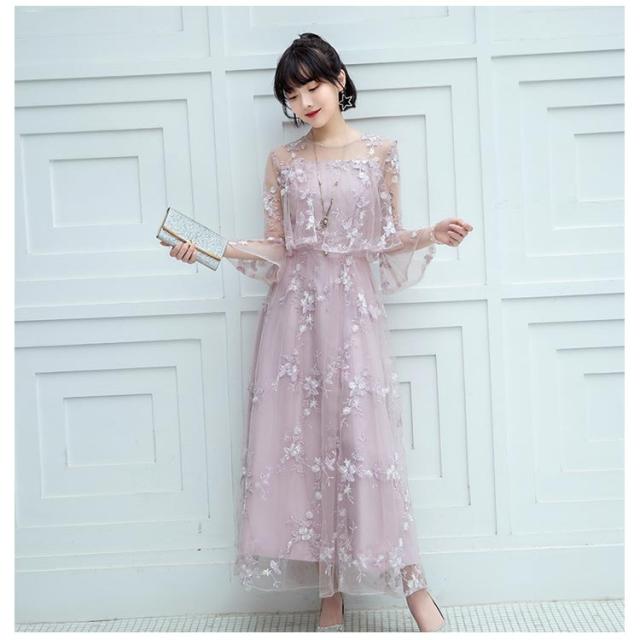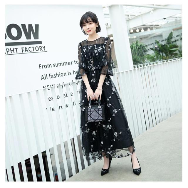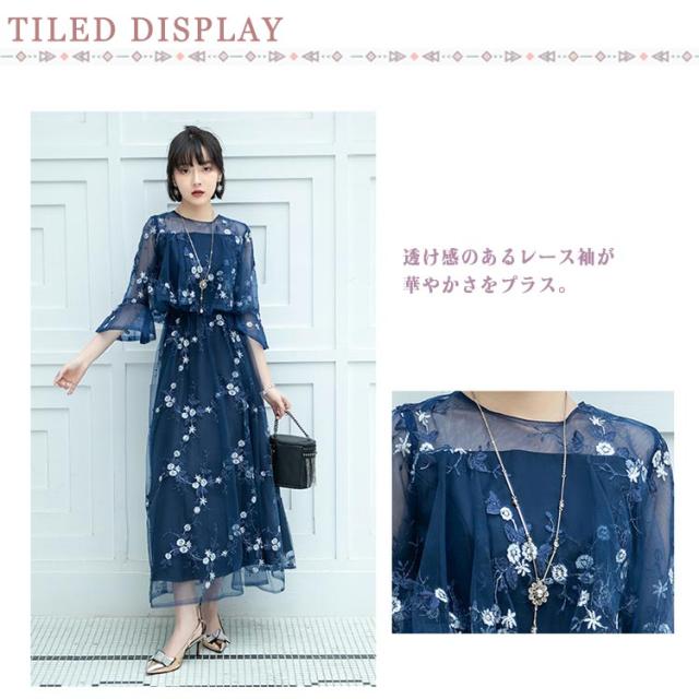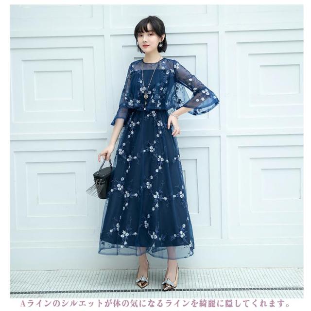 パーティードレス ドレス ワンピース 結婚式 大きいサイズ ロングドレス ロング丈 花柄 レース パーティードレス 透け感 大人可愛い 披露宴 お呼ばれ 七分袖 二次会 フォーマル チュール 上品 膝下 大きいサイズ 体型カバー 40代 30代