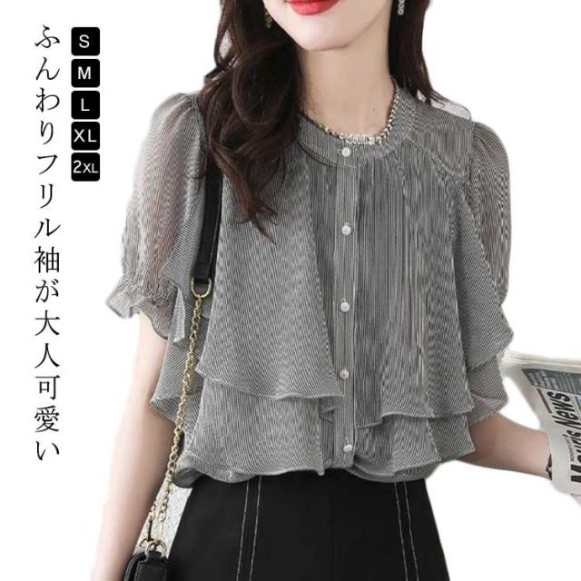 シャツ レディース フリルブラウス フレアスリーブ トップス きれいめ 夏コーデ 大人 涼しい 夏服 半袖ブラウス フレア袖 女性 おしゃれ 体型カバー ゆったり 薄手 パーティー フォーマル オフィス カジュアル 通勤 OL 結婚式 フリルブラウス 二次会