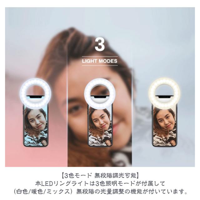 自撮り 照明 LDEリングライト LED 自撮りライト 撮影用ライト USB クリップライト 自撮り用ライト ledライト スマホ リングライト 高輝度ledライト 充電式ライト クリップ 式 充電式 ライト iphone 3色無段階調光モード