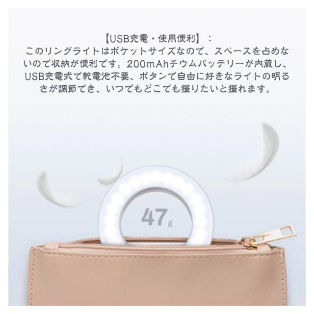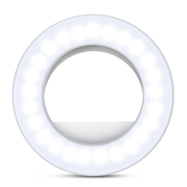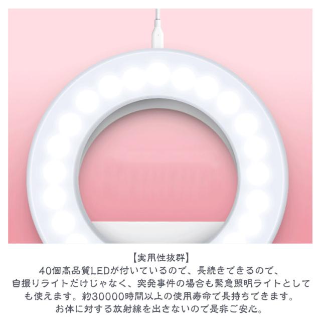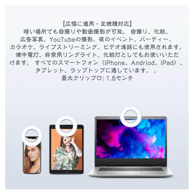 | 3色モード 無段階調光 USB充電式 高輝度:40個LEDビーズ付 クリップ式LED自撮りリングライト 【高品質40LED】 夜間でも、十分な光がない場合でも魅力的な写真を撮ることができ、驚きの美肌効果。 肌をツヤツヤし、瞳をキラキラするように見え、同時にの光補充ライトツールで、夜の自撮りやビデオを録画することができます。 【3色モード 無段階調光可能】本LEDリングライトは3色照明モードが付属して(白色/暖色/ミックス)無段階の光量調整の機能が付いています。1%〜100%の広い調光範囲、自然な柔らかい光を連続提供できます。色の温暖化の範囲は3500K - 6500Kです。異なるシーンにより、段階的に調節できます。 【USB充電・使用便利】:このリングライトはポケットサイズなので、スペースを占めないので収納が便利です。200mAhチウムバッテリーが内蔵し、USB充電式で乾電池不要、ボタンで自由に好きなライトの明るさが調節でき、いつでもどこでも撮りたいと撮れます。 【広幅に適用・全機種対応】暗い場所でも自撮りや動画撮影が可能。 自撮り、化粧、広告写真、YouTubeの撮影、夜のイベント、パーティー、カラオケ、ライブストリーミング、ビデオ通話にも使用されます。 懐中電灯、非常用リングライト、化粧灯としてもお使いいただけます。 すべてのスマートフォン(iPhone、Andriod、iPad)、タブレット、ラップトップに適しています。 。最大クリップロ: 1.5センチ 【実用性抜群】40個高品質LEDが付いているので、長続きできるので、自撮りライトだけじゃなく、突発事件の場合も緊急照明ライトとしても使えます。約30000時間以上の使用寿命で長持ちできます。お体に対する放射線を出さないので是非ご安心。 | |