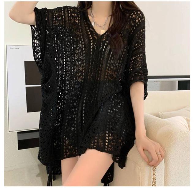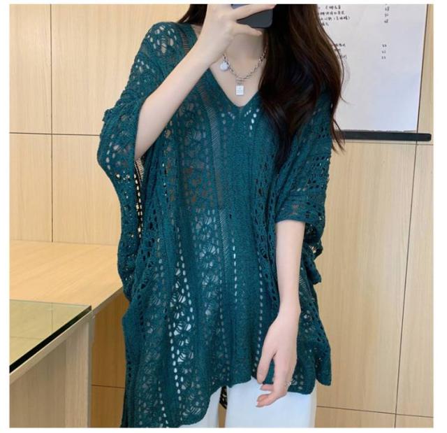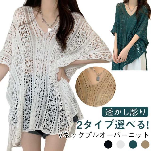 大きいサイズ 透かし編み プルオーバーニット ゆったり 透け感 薄手 サマーニット ニットソー ニット トップス Vネック シースルー 日焼け防止 ロング丈 ニット 大きいサイズ 夏服 紫外線対策 半袖 ドルマンシルエット