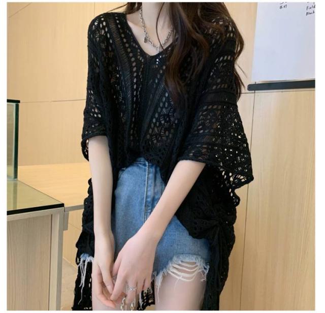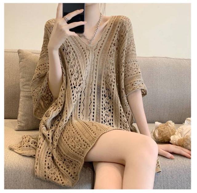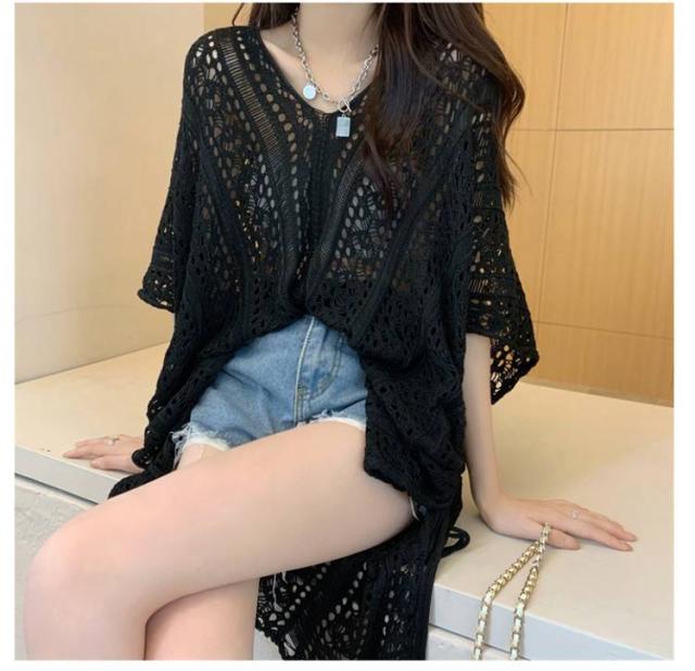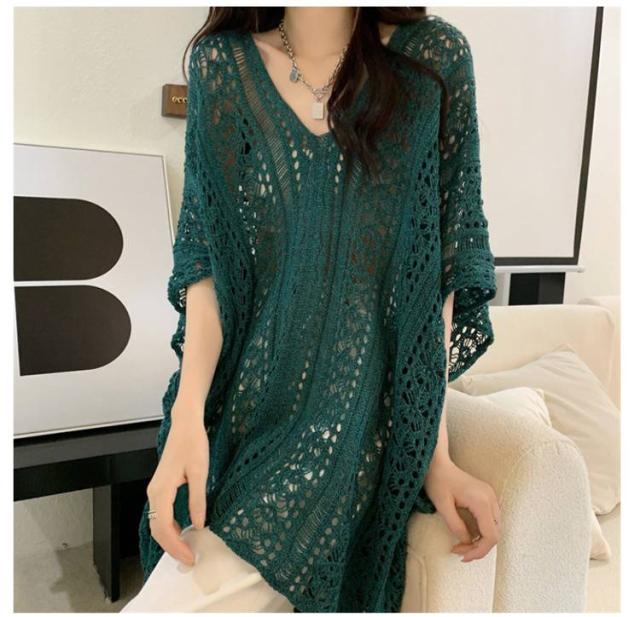 ニット ニットソー 大きいサイズ 薄手 体型カバー 日焼け防止 プルオーバーニット サマーニット ゆったり トップス Vネック シースルー 半袖 ロング丈 ニット 透け感 夏服 紫外線対策 大きいサイズ ドルマンシルエット