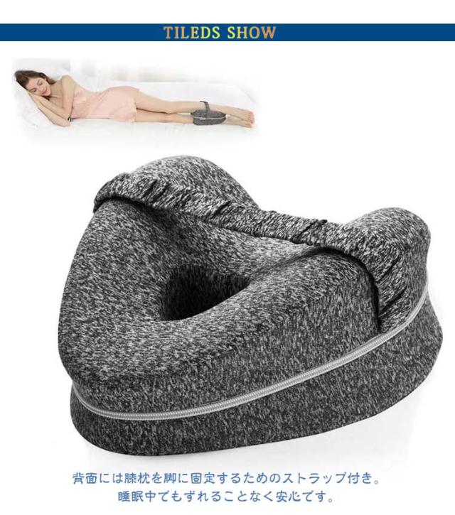 | 足に沿ったカーブ形状の膝枕 背面には膝枕を脚に固定するためのストラップ付き。睡眠中でもずれることなく安心です。 中心に通気穴が開いており、内側にこもった空気を外へ逃がす設計になっています。 カバーはチャックで着脱可能なため、中の枕を取り出してカバーだけ洗うことができ、衛生的にご使用いただけます。 横向きの姿勢で寝る際に使用します。片方の足にストラップを通して膝枕を固定し、両足で挟んで使用します。 足の丸みに沿ったカーブ形状で接触面積を増やし、かかる圧力を分散します。 内部にはやわらかい低反発ポリウレタンを使用。足への負担を軽減します。 また外側カバーは肌触りが良いためストレス無く快適に眠ることができます。 | |