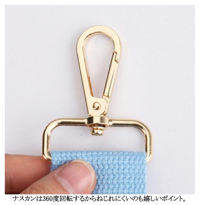 | キャンバス製のショルダーストラップ 高級感が漂うゴールド金具がアクセントに♪ 幅広ストラップで肩にかけても疲れにくいのも魅力的。 ナスカンは360度回転するからねじれにくいのも嬉しいポイント。 お手持ちのカバンに付ければあっという間にアクセサリー感覚でイメチェンができる。 | |