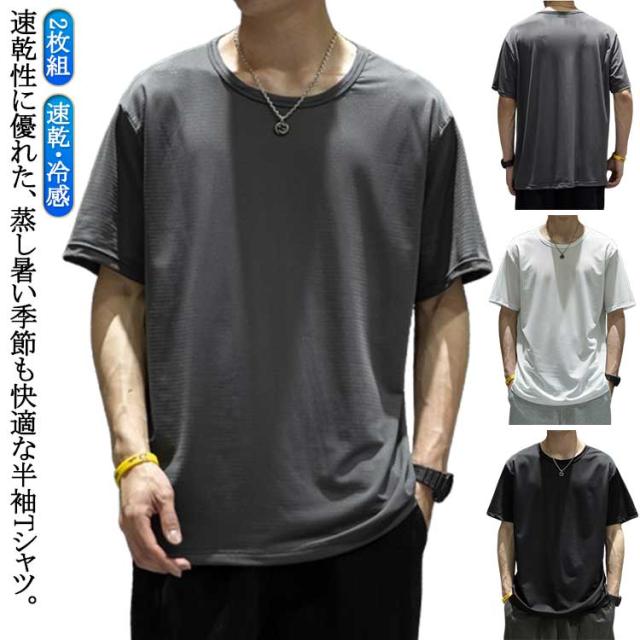 トップス UVカット メンズ tシャツ 大きいサイズ 接触冷感 ドライ tシャツ 涼しい 半袖 冷感Tシャツ 2枚セット 薄手 ロンT 速乾 夏用 ラッシュガード クルーネック 無地 カジュアル ひんやり カットソー