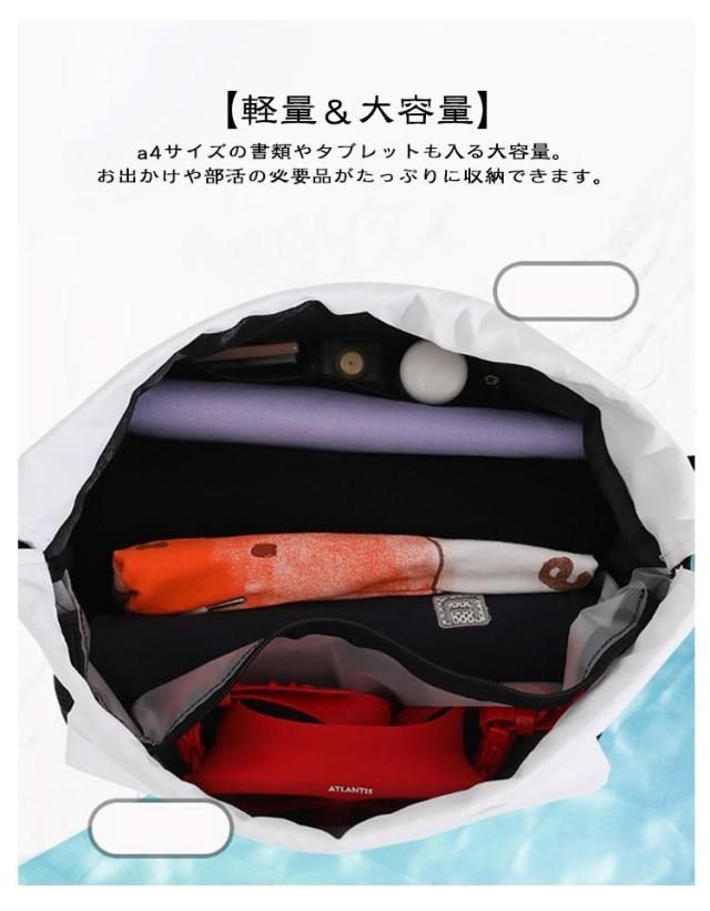 | 【軽量&大容量】a4サイズの書類やタブレットも入る大容量。お出かけや部活の必要品がたっぷりに収納できます。 【お洒落、シンプル】洗練されたシンプルなデザインは男女問わず、機能性とデザインを兼ね備えるリュックスタイルのスポーツバッグ。 【撥水加工】プール、ビーチや雨天などでも安心に!水と汗の侵入を防止し、濡らされる心配もいりません。 ※完全防水デザインではございませんので、長時間の浸水はおやめください。 【いろんなシーンで活用】ヨガやジムなど室内スポーツ用のジムバッグや水泳、スイミング教室、ビーチ遊び、海遊び、水遊び、磯遊びグッズのお片付けプールバッグや部活動、夏休みイベント、温泉旅行、修学旅行、花見、花火大会、お祭り時の着替え衣類と浴衣収納用の巾着バッグやちょっとした買い物や防災時の非常持ち出し袋にもご使用いただけます。 | |