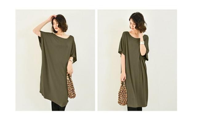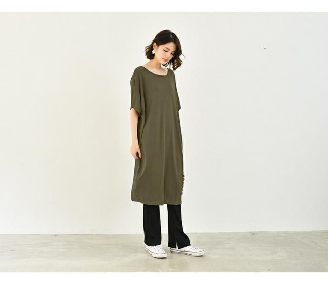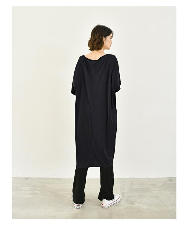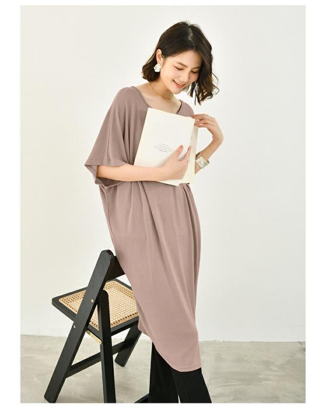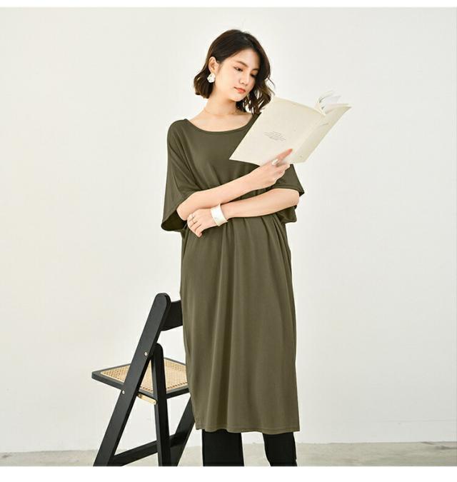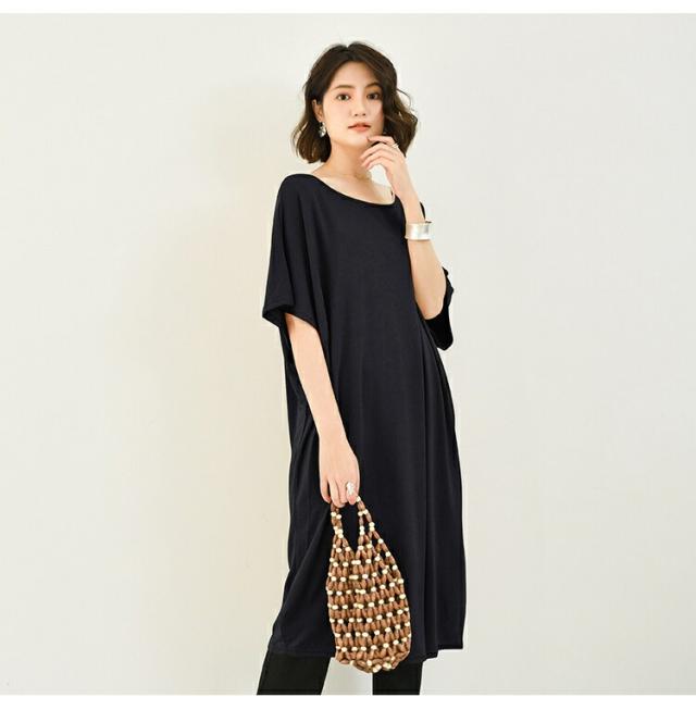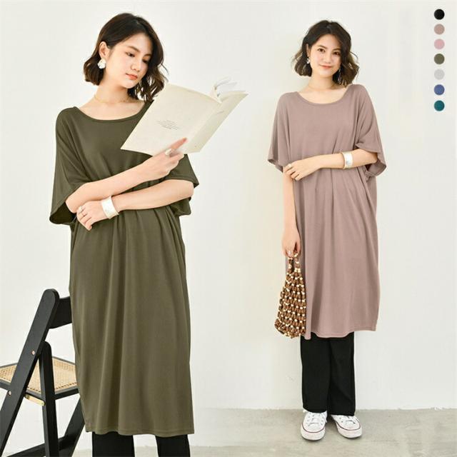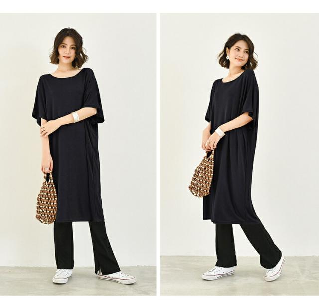 夏 半袖 ワンピース Tシャツワンピ ロングTシャツ パジャマ レディース 無地 体型カバー ゆったり 薄手 ミディアム丈 膝丈 モダール素材 大きいサイズ L-1065