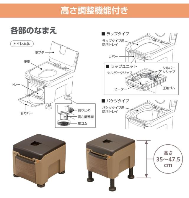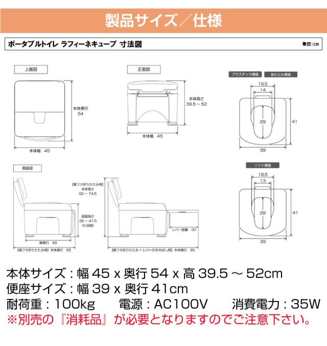 本体 幅45×奥行54×高さ39.5〜52cm 便座高さ 35〜47.5cm(2.5cmピッチ6段階) 便座サイズ 幅39×奥行41cm |