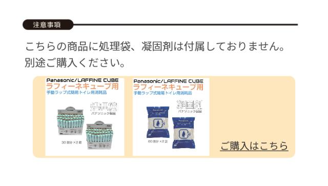 【コンパクトでおしゃれ、状況に合わせて使える】 ラフィーネキューブは見た目がオシャレなポータブルトイレです。 災害時、介護、アウトドア など様々な状況で活躍します。 【手動ラップタイプ】 ラップタイプは手動でレバーを引き上げるとわずか10秒で処理袋を簡単に圧着(ラッピング)することができ、臭い漏れを防ぎます。 圧着した処理袋はそのまま廃棄することができるので、排泄物の処理負担を軽減します。 ※専用処理袋と専用凝固剤の併用が必要です。 ※自治体によって分別の仕方が異なるのでお住まいの自治体にご確認ください。 |