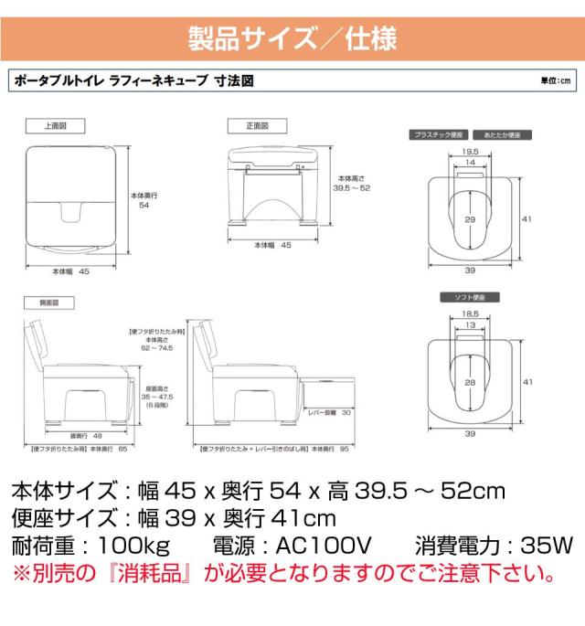 本体 幅45×奥行54×高さ39.5〜52cm 便座高さ 35〜47.5cm(2.5cmピッチ6段階) 便座サイズ 幅39×奥行41cm |