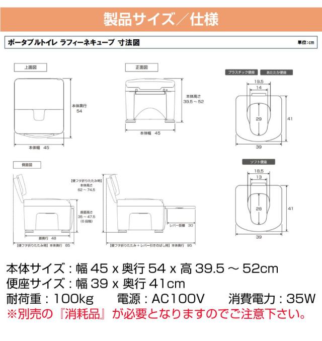 本体 幅45×奥行54×高さ39.5〜52cm 便座高さ 35〜47.5cm(2.5cmピッチ6段階) 便座サイズ 幅39×奥行41cm |