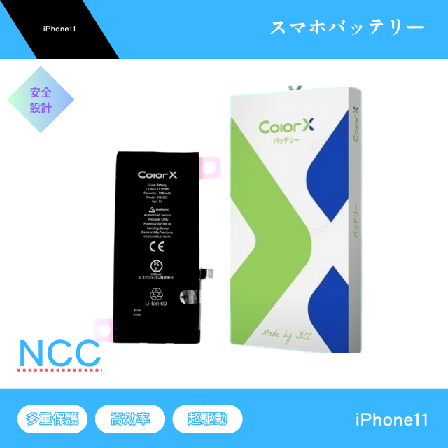 iPhone11 バッテリー NCC ColorX 交換 互換 バッテリー 防水シート バッテリーステッカー PSE取得