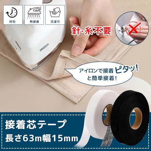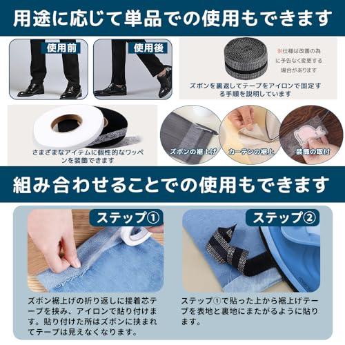 【内容量と製品仕様】 裾上げテープ4cm(新幅)×5M(長さ)*1本、黒の接着芯テープ15mm×63m*1本、両面用のメテープメジャー*1本、詳しい日本語取扱説明書*1本。