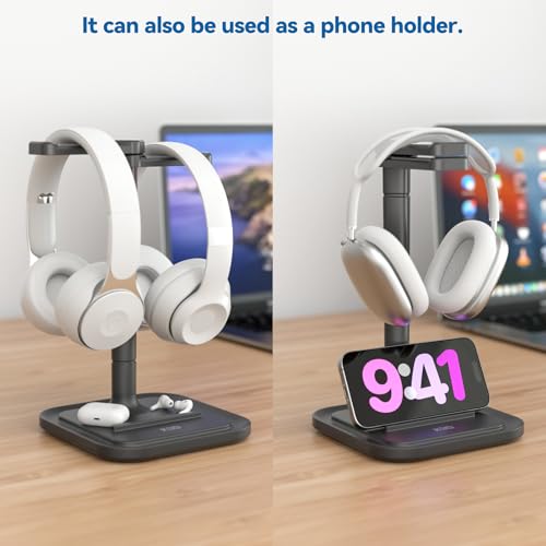 エクストラ・スマホスタンド - ヘッドホンを固定するだけでなく、このヘッドホンスタンドはスマホスタンドとしても使用できます。その底面の中央には滑り止めのバリアデザインがあり、スマートフォンを所定の位置に固定するのに役立ち、多目的で機能的です。