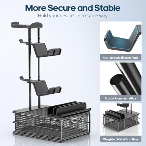アルミニウム構造-ゲームコントローラー 収納の主要な構造は頑丈なアルミニウムで作られており、最大限の安定性を確保し、デバイスを落とす心配なく収納できます。コントローラースタンドとヘッドホンスタンドはシリコンカバーで覆われており、デバイスに傷がつくのを防ぎます。