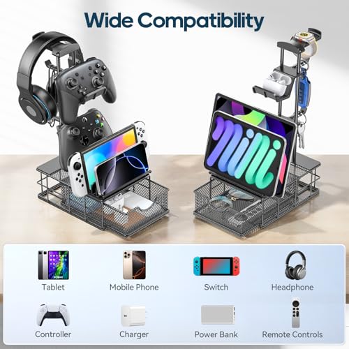 幅広い互換性-ヘッドホン置きはさまざまなヘッドホンやコントローラーに適合します。2つのコントローラーと1つのヘッドホンを同時に収納できます。溝の部分には、にスマホ、iPad、Switchを置くこともできます。オールイ