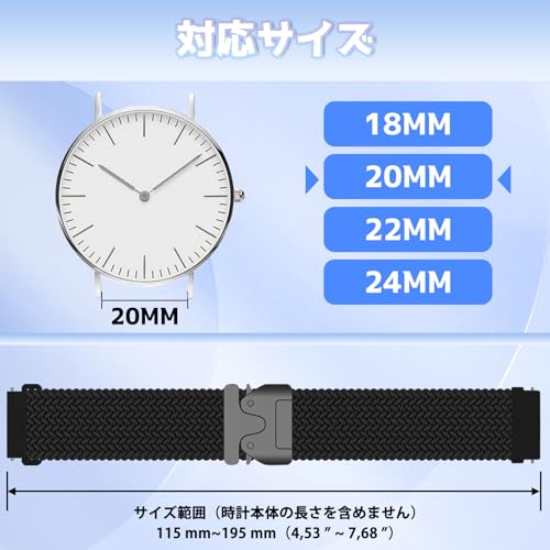 20mm バンド 交換バンド 20ミリ スマートウォッチ 交換ベルト 替えベルト 時計バンド 伸縮性 ストラップ ナイロン 編み込み スポーツバンド 通気性 クイックリリース (20mm ブラック) 送料無料