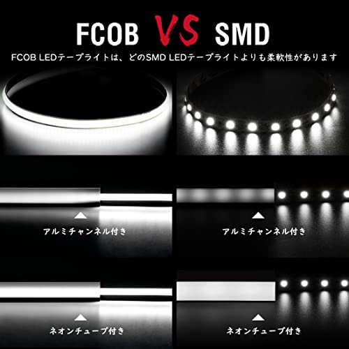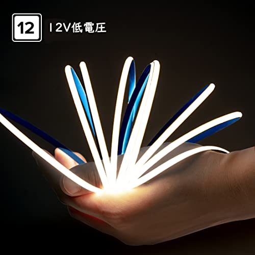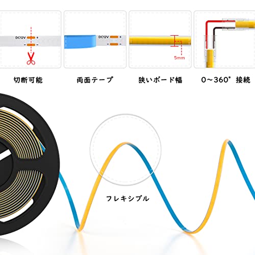 「超明るい」 DC12V 480LEDs/m 5M 5mm 昼光色 6000K。フレキシブルチップを搭載したボードのFCOB LEDテープライト。従来の5050 SMD 3528 SMDに比べ、FCOBテープライトの緻密な発光ユニットは、中間部の黒つぶれを防ぎ、明るく、柔らかく、均一な光を作り出します。