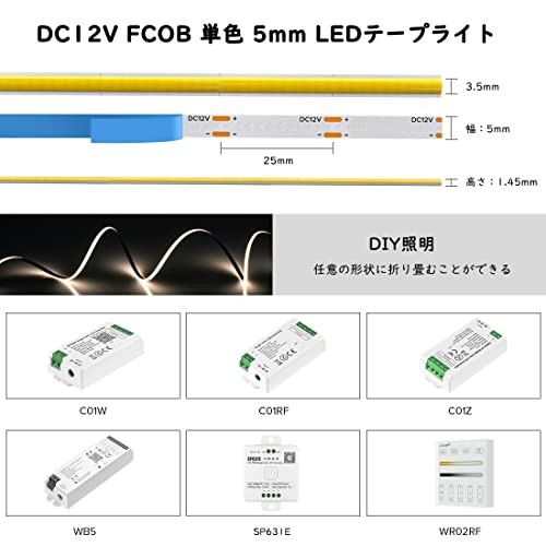 FCOB COB LEDテープライト 高密度 フレキシブル LEDテープライト 5M 480LEDs/m 2400LEDs/5m 昼光色 6000K 幅5mm ストリップライト DC12V 6W/m 調光可能 変形可能 切断可能 寝室 キッチンホーム 屋内装飾 エネルギークラス A+++ 非防水