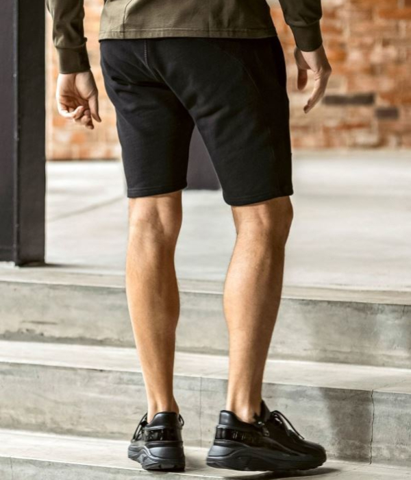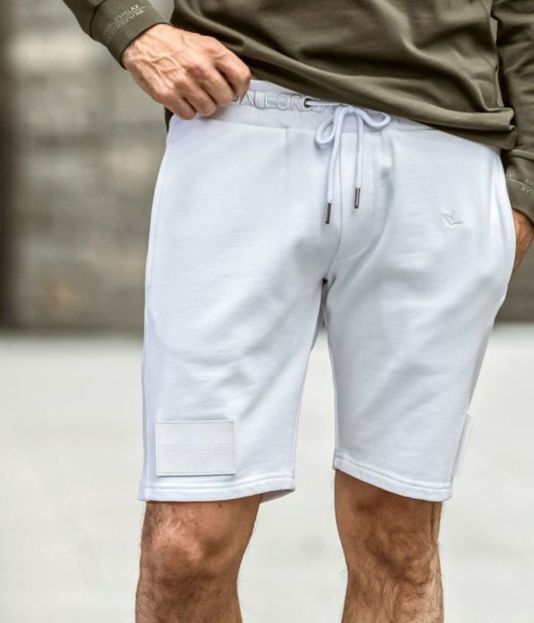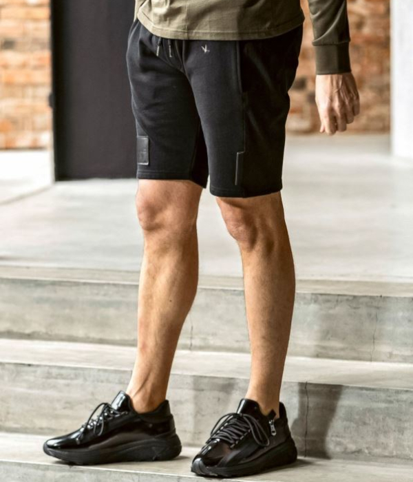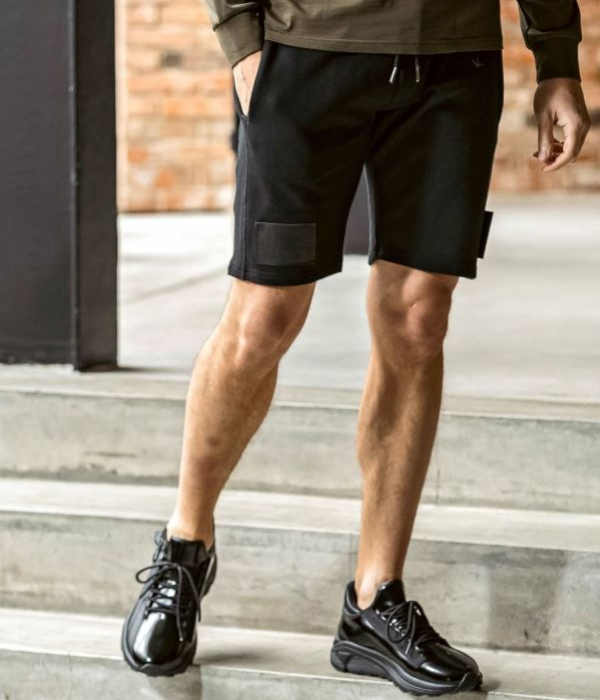 フェイクレザーに箔押しでブランドロゴを刻んだオリジナルのパッチがアクセントのハーフパンツ。