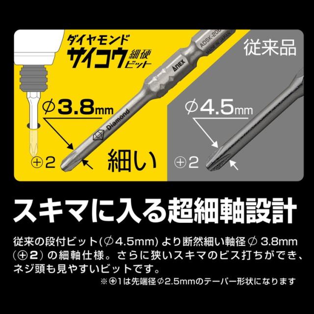 マグネットでつかないステンレス・真鍮・アルミ・樹脂ネジを締めたり、狭い隙間でのビス打ちにご利用いただくドライバービットです。ビット表面はサビに強い無電解ニッケルメッキ+ダイヤモンドコーティングで、マグネットにつかないネジに喰らいつき、落としません。従来の段付きビット(Φ45mm)より断然細いビット軸径Φ3.8mmの細軸なので、隙間のビス打ちが可能で、ネジ頭も見やすいです。新硬強度鋼によりHRC62.5の高い硬度を実現し、刃先の耐摩耗性を上げました。また、独自の熱処理により生じた高靭性により、折れに強く高い耐久性です。(従来品の2倍の耐久力)