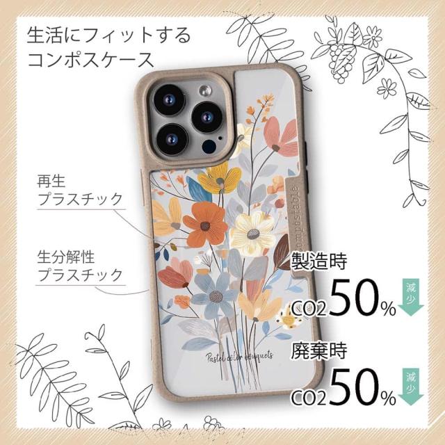 | 注意事項 | コンポスケースは、フレーム部分に「生分解性プラスチック」という環境に優しい素材を使用しております。そのため擦ったり、ぶつけたりする衝撃を与えると脆い部分もあります。耐衝撃ケースではないことをご了承ください。 Qi充電やMagSafe充電にも対応していますが、装着していない時に比べると充電速度は落ちます。 |