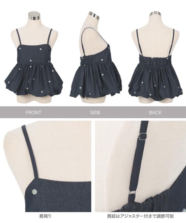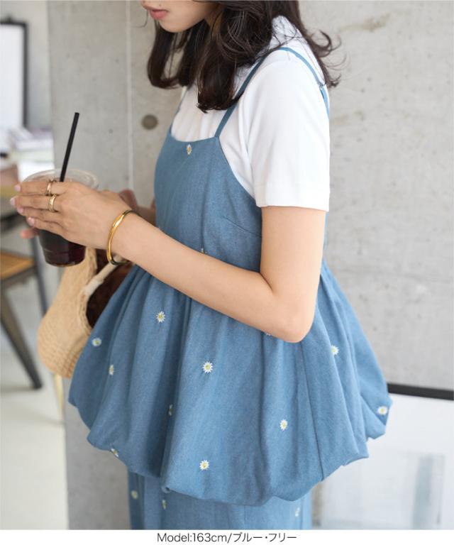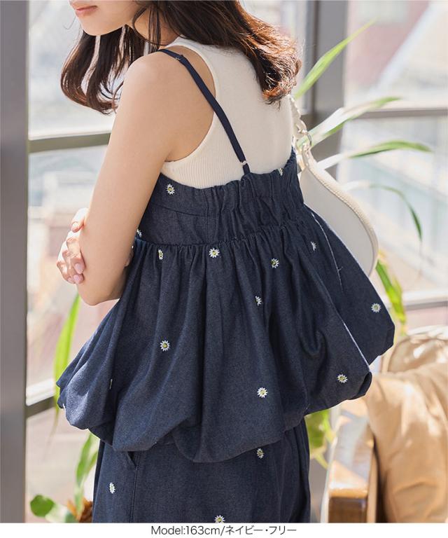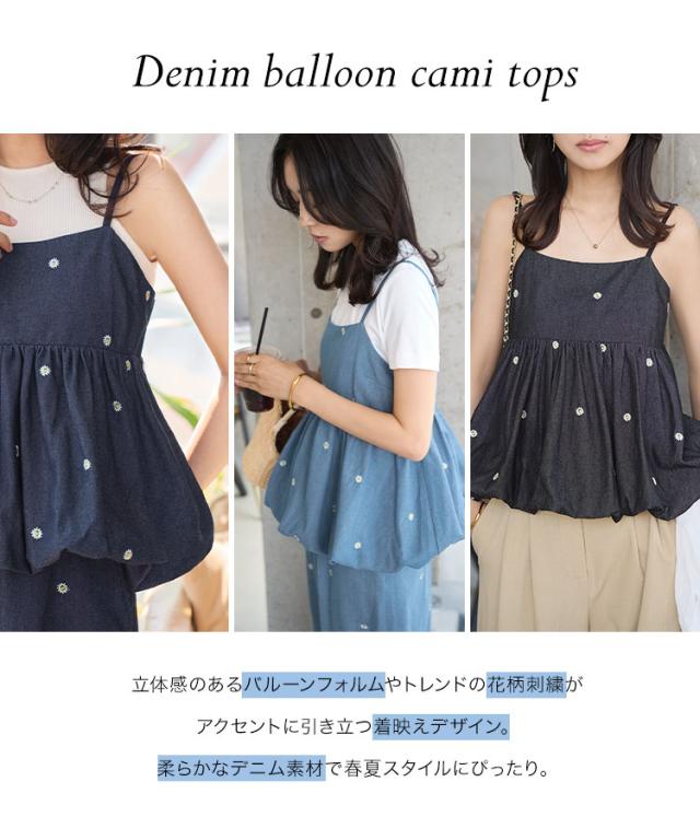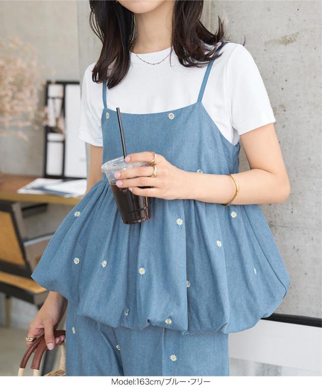 刺繍デニムバルーンキャミトップス C7583 入荷済 レディース 20代 30代 40代 トップス キャミソール デニム バルーン 刺繍 花柄 セットアップ キャミトップス 夏トップス ショートトップス フラワー 総柄 プリント ブルー ネイビー ブ