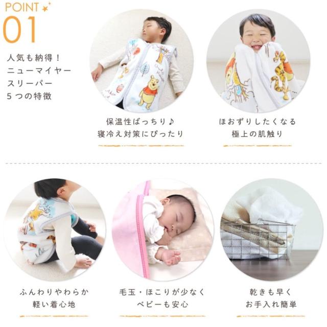 お布団を蹴飛ばしても安心!寝相の悪いあかちゃんにも寝冷え対策にバッチリです。ふんわり軽くてやわらかい素材なのでベビーにもピッタリです!ベビーの首や顔にファスナーが直接当たるのを防ぐため、ファスナーのエンド部分にカバーを付けていますので安心してご使用頂けます!