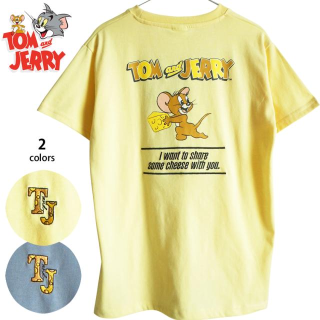 送料無料 トムとジェリー Tシャツ レディース ジェリー 刺繍 バックプリント スマイル チーズ 穴あきチーズ かわいい ブルーグレー 黄色 イエロー くすみカラー Tom&Jerry ねずみ 半袖 メンズS M ペアルック レトロ アメコミ 双子コーデ 男女兼用 大人 春夏