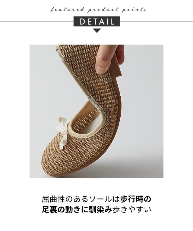 パナマメッシュ調の生地が足元からシーズンムードを高めてくれる日本製のバレエシューズ。フロントにはさりげないミニリボン付きで、ガーリー・フェミニンなスタイルがお好きな方も、シンプルになりがちな夏のコーディネートにちょっぴり甘さを加えたい方にも満足いただけるデザインです。ぺたんこ仕様のフラットソールで気兼ねなく履けます。 ■ポイント ・涼しげなメッシュ素材 ・屈曲性のあるソールが足裏の動きに馴染み歩きやすい ・甲高や幅広、ふっくら足さんなど、足のお悩みをお持ちの方に心地よく履いていただける設計 ■ニッセンオリジナルの大きいサイズ規格 本当に合う靴に出会った事はありますか ニッセンの4Eは、靴底の幅を広げ、甲や足首周りもゆったりの独自設計。 靴のサイズにお悩みのお客様へ向けて、サイズが大きくてもバランス良くきれいに見えるよう企画したオリジナルシューズです。