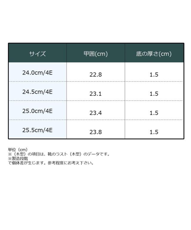 材質=合成繊維 底材=合成底 底の厚さ(後ろ)=約1.5cm ワイズ=4E 重量=約160g(4E:24.0cm片足) ※生産時期や素材などによって多少個体差があります。 原産国:日本製 備考:単位(cm) ※(木型)の項目は、靴のラスト(木型)のデータです。 ※製造段階で個体差が生じます。参考程度にお考え下さい。