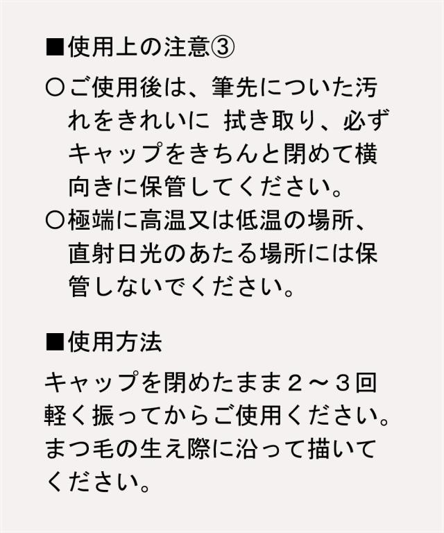 ■使用方法 キャップを閉めたまま2〜3回軽く振ってからご使用ください。まつ毛の生え際に沿って描いてください。 ■内容量 0.55ml 原産国:中国製