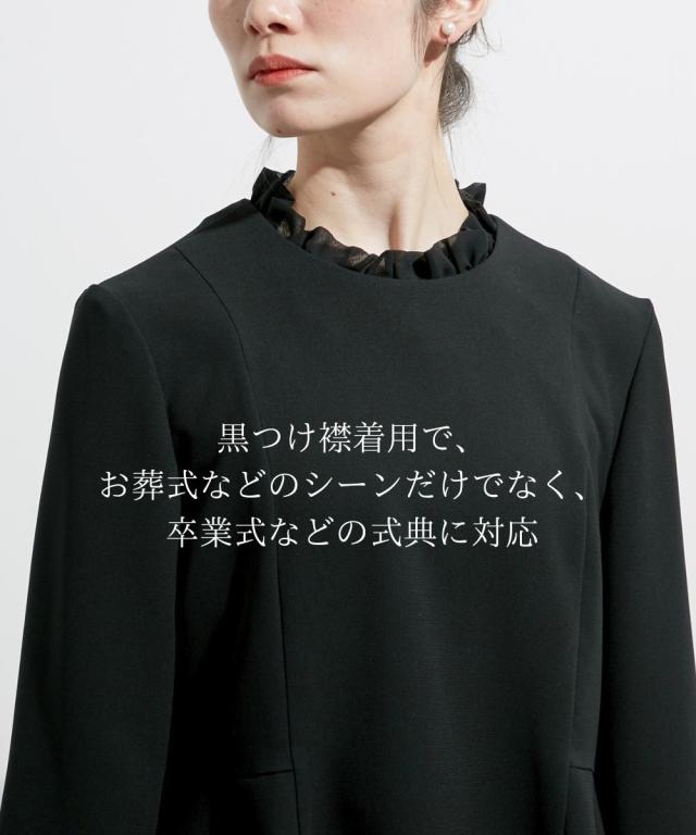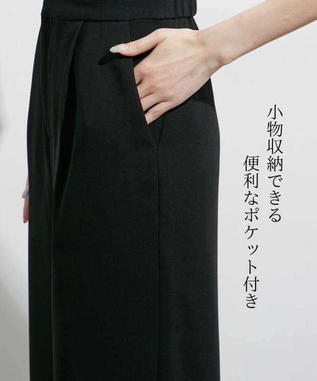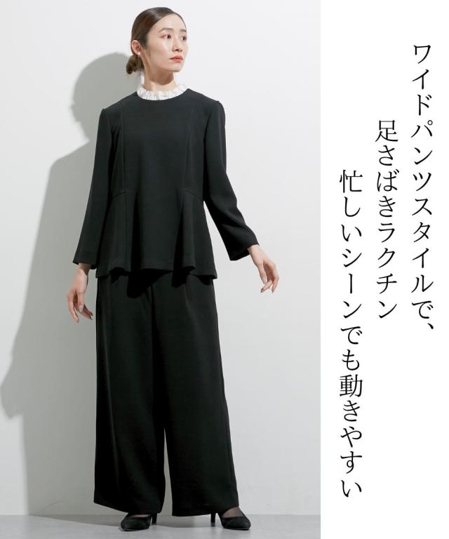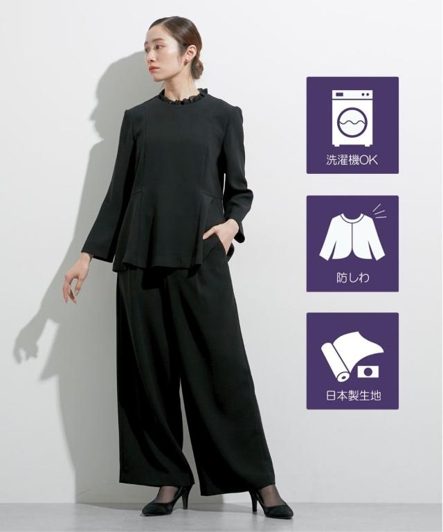 【喪服・礼服】日本製生地使用 洗える防しわ慶弔両用取り外しフリル襟デザインブラウス+ワイドパンツセットアップ 〔Callarus〕