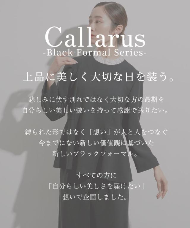 【Callarus(カラルス)】〜for Black Formal〜 まっすぐブレない美しさで人々を魅了する花“calla lily”と ラテン語で輝くという意味の“clarus”を合わせた造語がブランド名の由来です。 <自分らしく上品で美しい装いを大切にする方へ> 縛られたカタチではなく、「想い」が人と人をつなぐ シーンにもテイストにも年齢にも縛られない自由な着こなしを実現する新しいブラックフォーマル。 こだわりポイント 2色(黒・白)のフリルつけ襟で、シーンに合わせて着こなしを変化できる慶弔両用セットアップスーツ 取り外しできるフリル襟付ブラウス 黒フリルでお葬式に対応 白フリルで、セレモニーシーンなどに着まわせます ペプラム切替で可愛い雰囲気を演出 ワイドパンツシルエットでこなれた着こなしに ほどよい厚みでハリ感ある日本製二重織生地を使用 ブラックフォーマル生地(漆黒)を使用、きちんと感のある装いに 防しわなので、しわになりにくい。 洗濯機(ネット使用)で洗えるので、お手入れ楽チン!ご家庭でお手入れができます 喪服・礼服としてだけでなく、入卒・結婚式・参観日・卒業式など、 すべてのフォーマルシーンに対応できる喪服礼服ワイドパンツセットアップスーツです。 体型