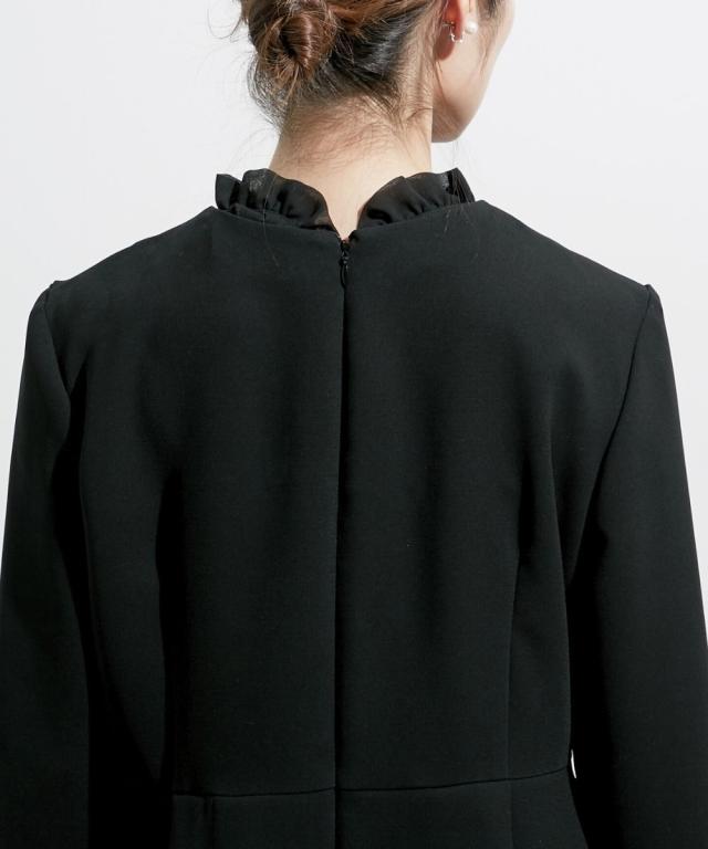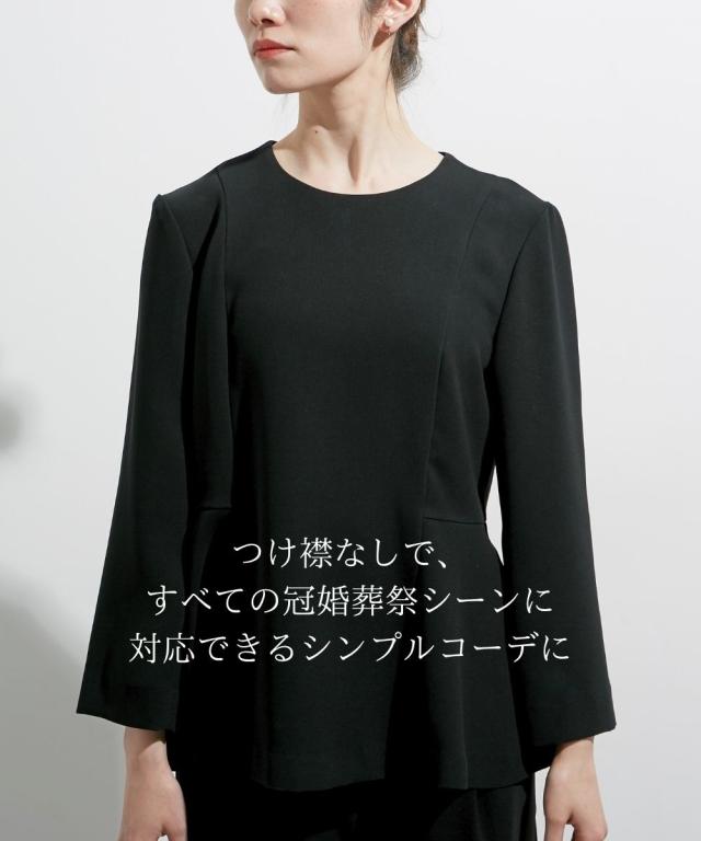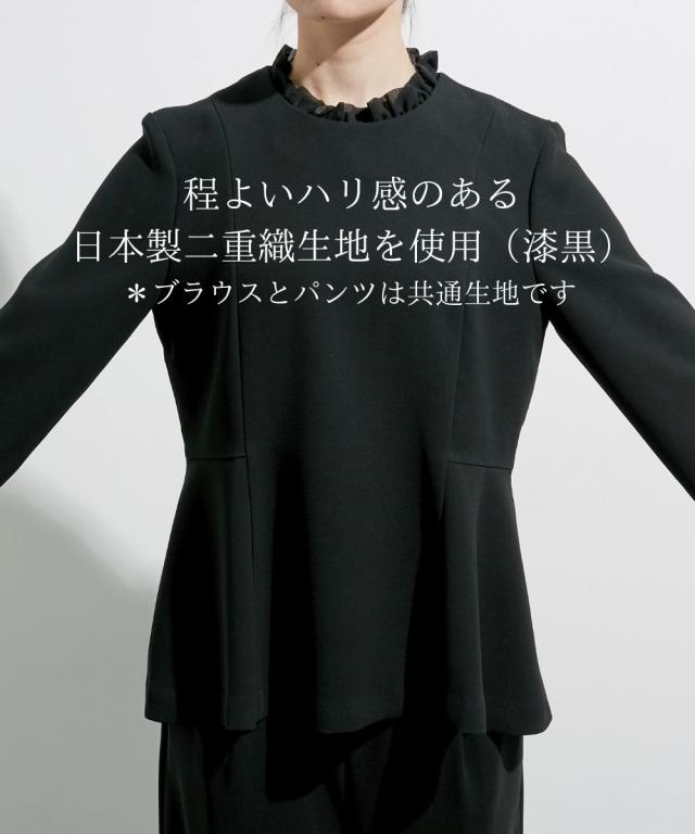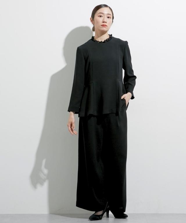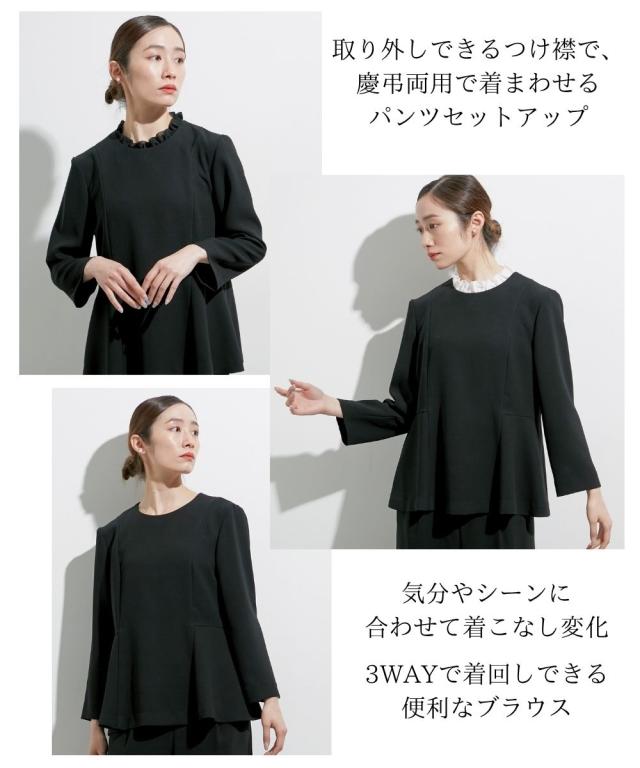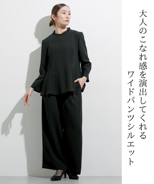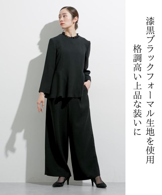 【喪服・礼服】日本製生地使用 洗える防しわ慶弔両用取り外しフリル襟デザインブラウス+ワイドパンツセットアップ 〔Callarus〕