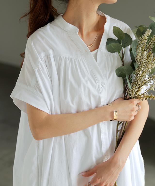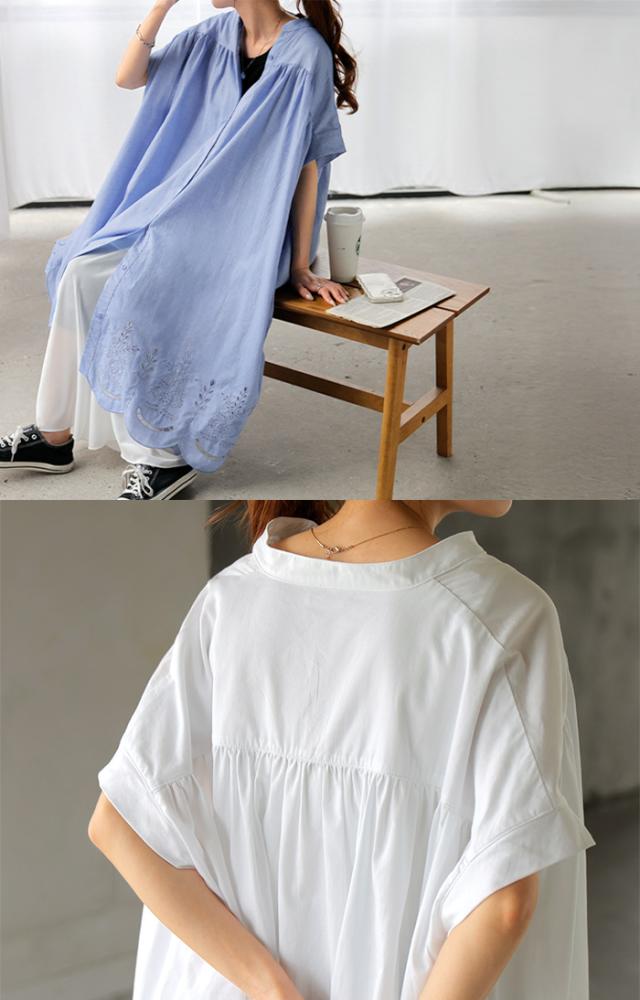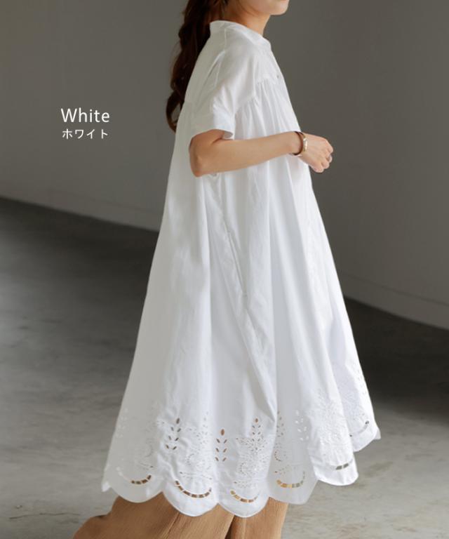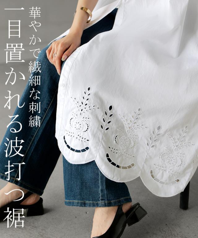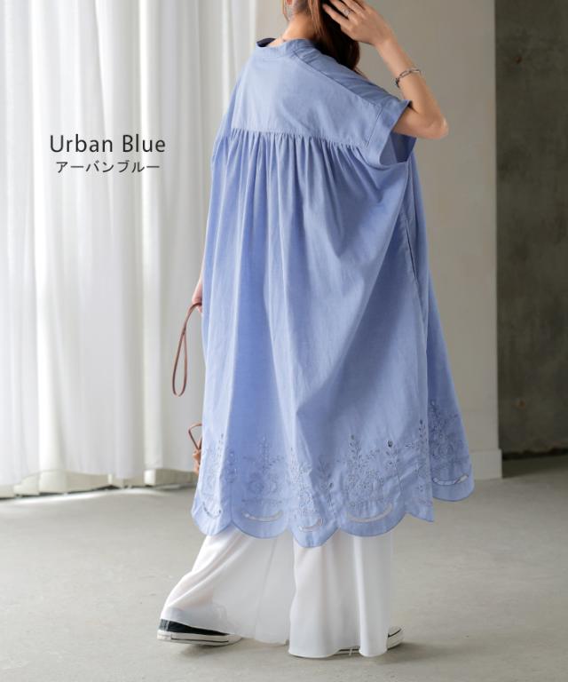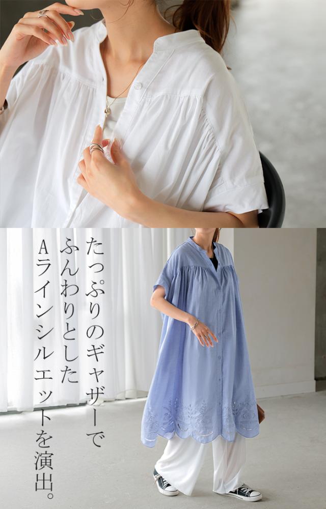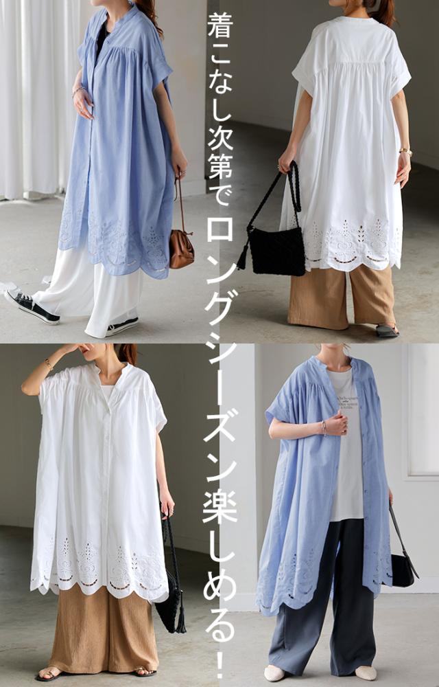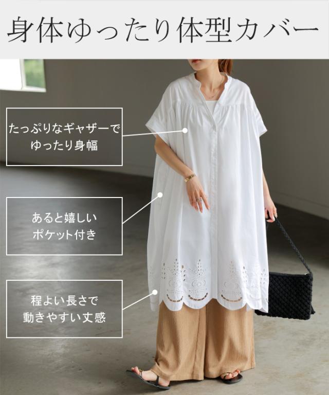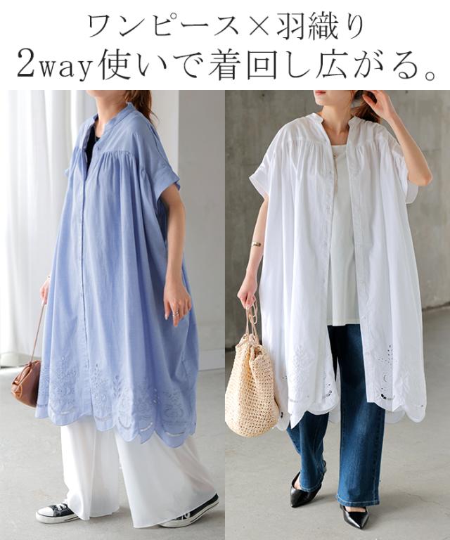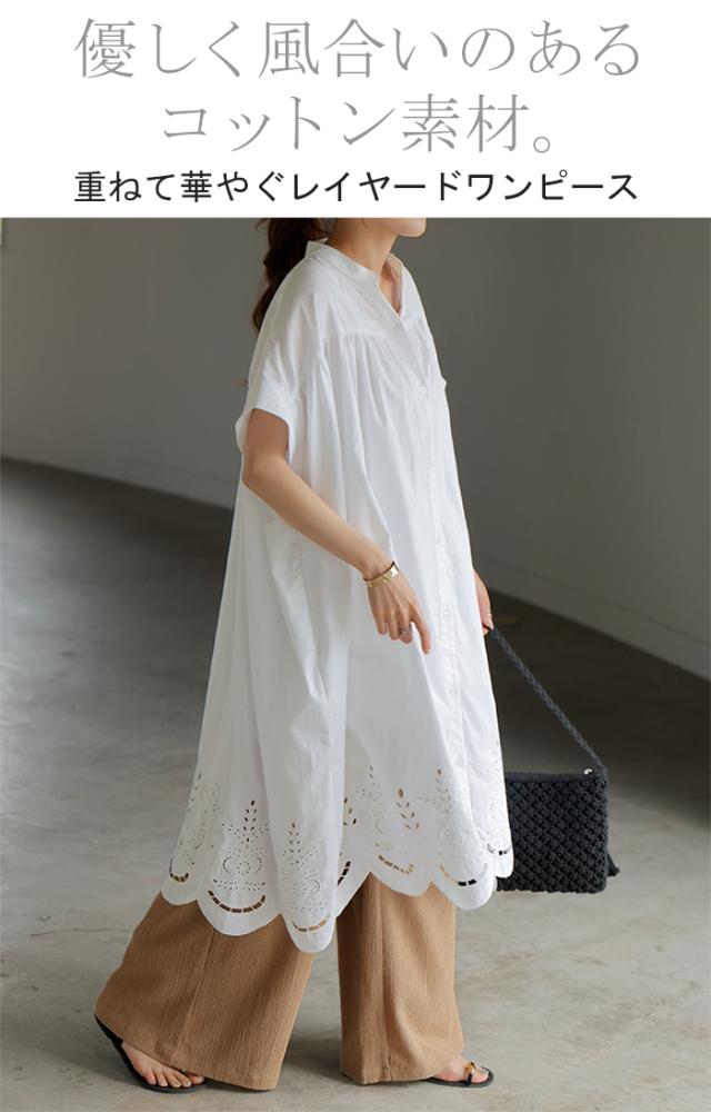 ワンピース レイヤード シャツワンピース シャツ 刺繍 スカラップ 綿100 ノーカラ— シャツワンピ レディース ロング ロングワンピース Aライン ワンピ ロングシャツ ロングワンピ 半袖 羽織 体型カバー 二の腕カバー 無地 青 白 春 夏 HUG.U 秋新作