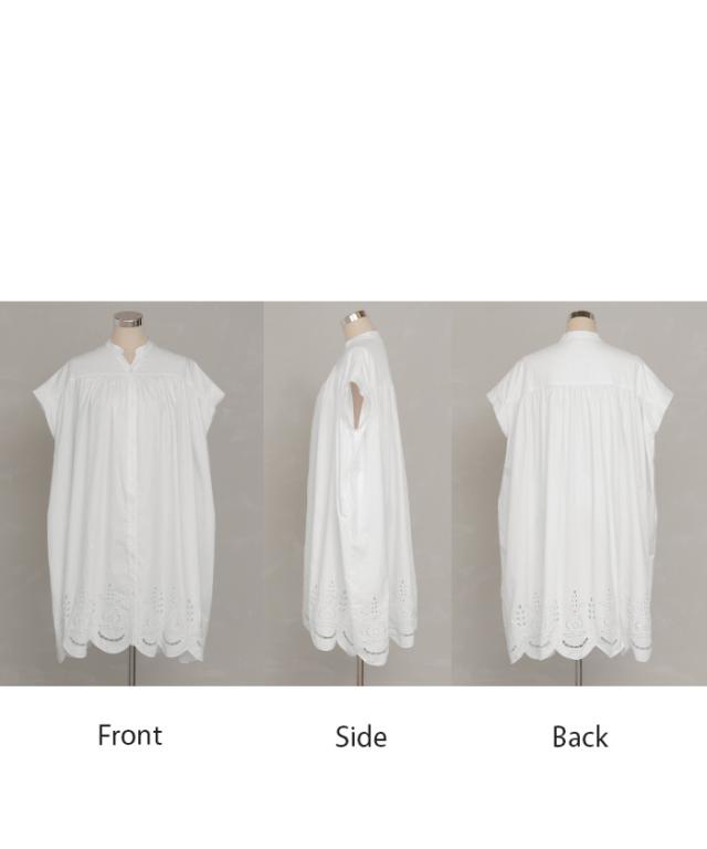 裾に刺繍レースを施したバンドカラーのシャツワンピースです。