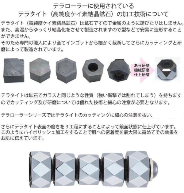 ローラー部分にテラタイトを使用したフェイシャル&ボディケア用波動ローラーです。テラタイトから放射されるテラヘルツ波は1秒間に約1兆回振動を放つといわれ、この振動が近年、健康や美容にとても良い鉱石として注目されています。個別に回転する4個のローラーと40面にダイヤカットにすることで肌へのタッピングをより細かく優しくしています。さらにトップ部分もテラタイトになりツボ押しなどで使用できます。お湯や冷水を利用することにより瞬温・瞬冷作用により優れたトリートメント効果を発揮します。フェイシャルからボディケアまで全身使用できる健康&美容ローラーです。